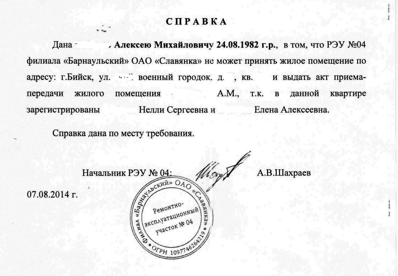 А справку выдает отделение РУЖО (РУЖО, ДЖО)"Славянка" составляет акт приемки помещения