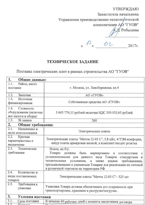 Открытый запрос котировок среди субъектов малого и среднего предпринимательства на право заключения договора на поставку электрических плит в рамках строительства АО «ГУОВ»
