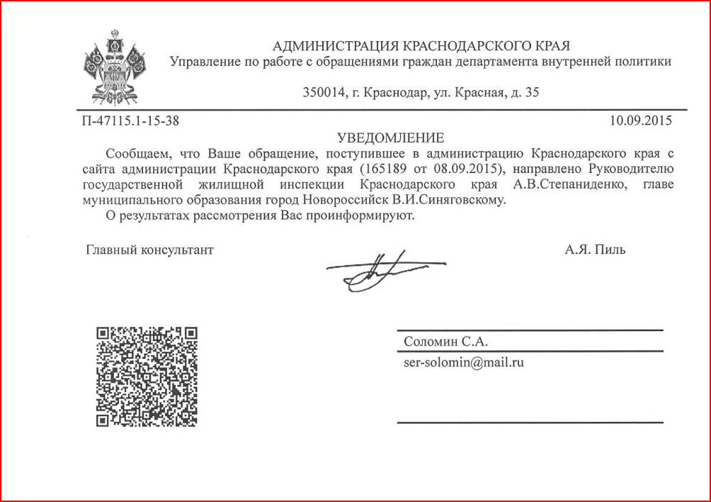 Во вторник получил первый ответ по нашей коллективной жалобе. Скан выкладываю на всеобщее обозрение. Непонятно, почему они отправили в Новороссийск? Но это не страшно, оттуда переправят в Анапу. Главное есть реакция.