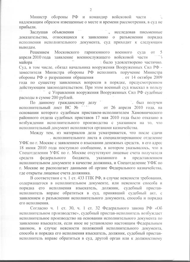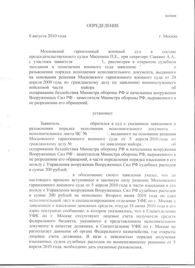 На руках вступившее в законную силу определение суда и исполнительный лист на взыскание судебных расходов с в/ч. Проблема в том что у в/ч нет своих счетов ни в одном отделении ФК (казначейство). Обратился в УФК по области, посоветовали обратиться в суд повторно с просьбой о вынесении нового определения и замене исполнительного листа ( как я понимаю, о замене ненадлежащего ответчика ???) Как всё это должно выглядеть и с чем ( что просить? ) мне идти в суд ?