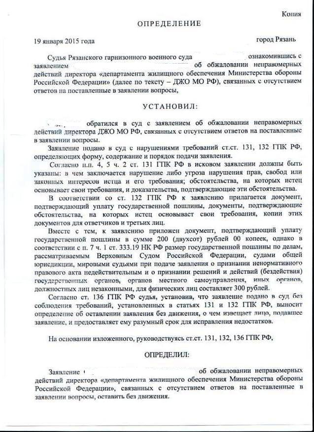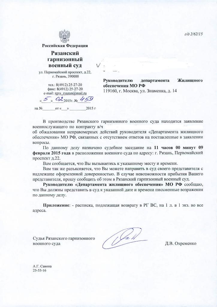 Дорогие друзья и сочувствующие, для оживления данной ветки, сообщаю, что моё заявление об обжаловании неправомерных действий директора «Департамента жилищного обеспечения Минобороны России» от 27 декабря 2014 г. приняли к рассмотрению 23 января 2015 г.