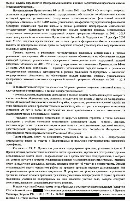 Ответом заинтересованного лица от 7 октября 2014 года (получен по почте 6 ноября 2014 года), мне было отказано во включении в списки участников подпрограммы "Выполнение государственных обязательств по обеспечению жильем категорий граждан, установленных федеральным законодательством" Федеральной целевой программы "жилище" на 2011 - 2015 годы», со ссылкой на то, что я не отношусь к категории граждан, указанных в п.п «а» п. 5 Правил выпуска и реализации государственных жилищных сертификатов в рамках реализации подпрограммы "Выполнение государственных обязательств по обеспечению жильем категорий граждан, установленных Федеральным законодательством" Федеральной целевой программы "Жилище" на 2011 - 2015 годы ( Постановление Правительства РФ № 153 от 21 марта 2006 года), далее – Правила.