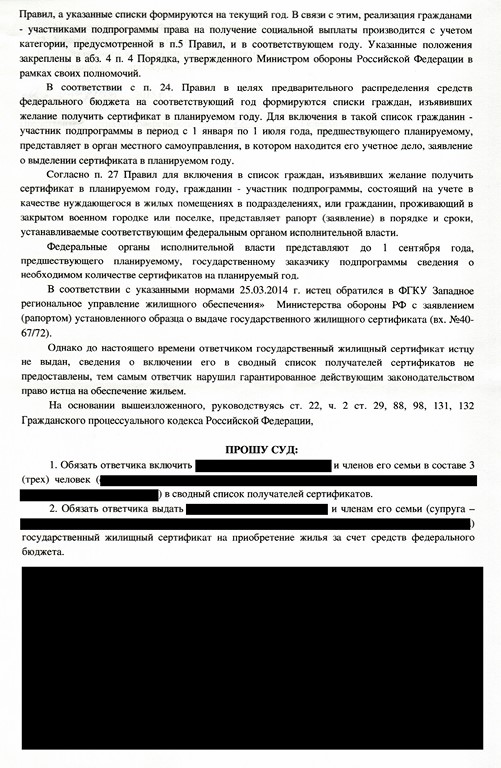 Вот ссылочка на опеляцию https://rospravosudie.com/court-zabajka ... 450693684/. Исковое заявление сейчас найду и выложу. В кратце: обязать ГКУ Западрегионжилье включить меня и членов моей семьи в сводный список получателей ГЖС, а также выдать ГЖС.