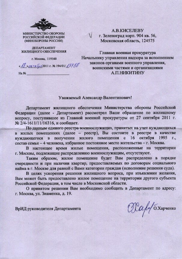 Ну вот, дожились. Указания г-жи Харченко стоят выше решения суда (сила закона). А ВГК по-барабану, она же выполняет указания МО , а не закон. И где вы видели, чтобы гражданский человек в возрасте 27 лет, неимеющий к ВС РФ никакого отношения, занимался распределением квартир в/с, у которых выслуга 30-35 календарей. Человек, который, даже каплей не висела на х.., когда мы служить пошли, призывает нас к неисполнению решения суда (согласившись на Моск. обл., вместо Москвы). Такие чиновники нам не нужны.Очередная отписка.