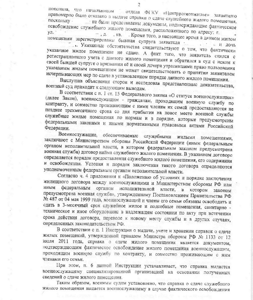 а вот и решение суда в отказе мне выдать справку о сдаче жилья...интересно, что в/судья указал, что жилище я в компетентные органы не сдавал.....как это не сдавал!...я пытался сдать...обращался в Славянку, они мне дали письменный ответ что акт составить и принять помещение не можем, т.к. прописаны Бывшая и ребенок!