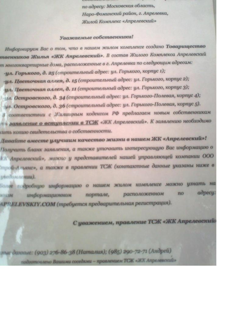 А мы вчера таки дозвонились по телефону 8-495-696-89-26 (по второму номеру 8-495-696-82-50 не получилось), только ответ не порадовал, сказали, что информации о наличии приказа на ОУ по квартирам в Апрелевке у них нет.