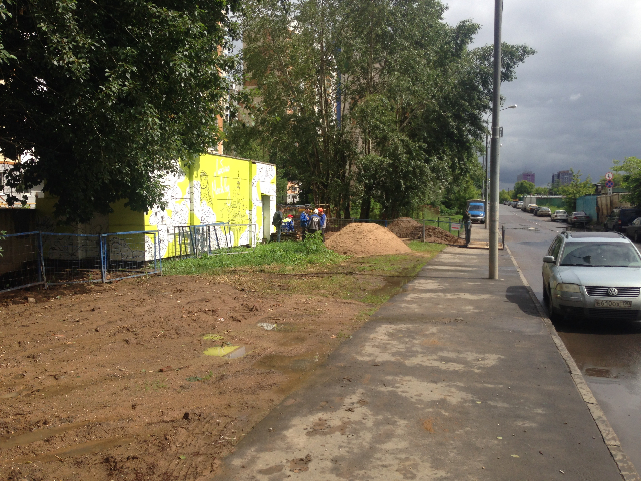 15 корпус. Видно постоянное движение людей с мешками))) вторую часть дороги, залили бетоном. Площадки засыпали щебнем и утрамбовали... на Дыбенко с электричеством работы идут. Местами засыпано, местами ещё варят.