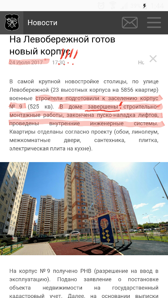 #40995Что за пустословие, корпус передают под заселение, выполняются работы по опрессовке водопровода внутриА 7 корпус - он 3 года в росреестре. И все другие бумаги на него оформлены с год назад. И чо?QR_BBPOST Jucha, разве ГУОВ не правы в своих заявлениях?! Все так и есть как сказано, только почему новоселов нет, так в Росреестре не зарегистрирован корпус, вот и оформлять и передавать ДЖО не может жилые помещения.