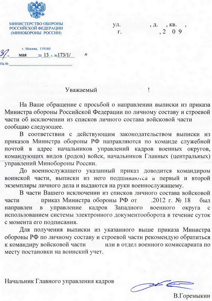 Прошу подсказать, у кого была подобная ситуация и взможные варианты ее решения. Решением ГВС от июня 2012 г. восстановлен в СЧ. После долгой переписки с КЧ, МО. Состоялся приказ МО РФ по ЛС. При том , что проект его был отправлен из части августом 2012г, а подписание состоялось июлем 2012г. О дате и номере приказа мня письменно известил ГУК. Данным приказом я исключен с 20 сентября 2012г. Деньги пришли где-то 25 октября 2012г., при том какими-то кусками. Далее пытаюсь отыскать данный приказ, что-бы узнать, что же в нем написано (выслуга, отпуск, выплаты). В часть он не поступал (в конце 2012г она была переформирована), в адрес правопреемника так же. В ВК то же его нет. В январе 2013г. делаю запрс в ГУК - в ответ тишина более 2,5 месяцев. Обращаюсь с жалобой на неответ ГУК в адрес МО в апреле 2013г. В июне получаю отписку начальника ГУК. Что дальше ? В суд на отказ?