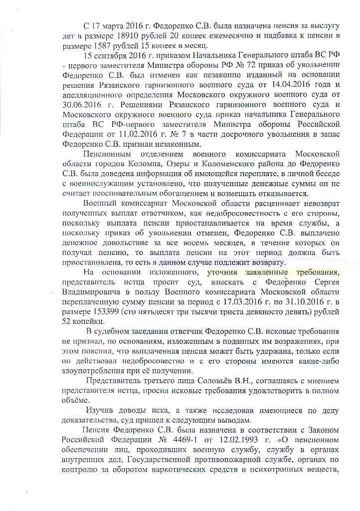 #4123Ага, т.е. что и уволенным никогда не был?...это бред. Причем недобросовестности тоже нет. Почему же про ст. 1109 забыли.после восстановления в списках личного состава воинской части с момента исключения из них, то есть с ДД.ММ.ГГГГ, он утратил право на получение пенсии...При этом судебная коллегия учитывает, что действительно со стороны ФИО1 отсутствуют какие-либо умышленные действия, направленные на неправомерное завладение денежными средствами