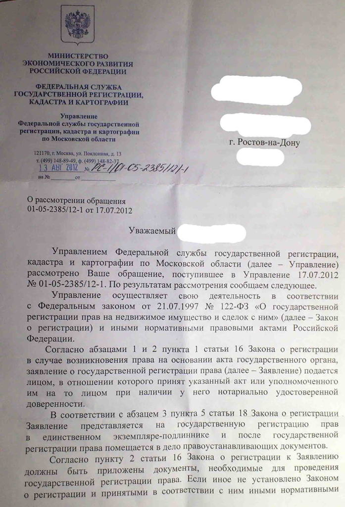Через сайт Росреестра 7 июля 20121 года мною было отправлено следующее письмо: