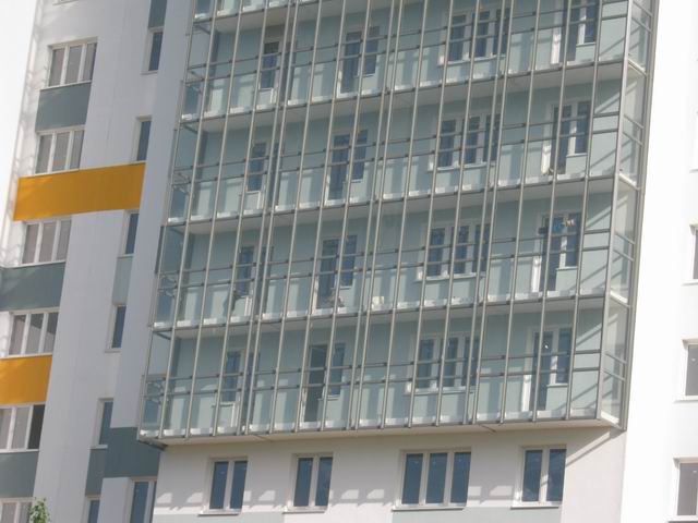 Это подошло бы для офисного здания, но стеклянное сплошное ограждение совсем не вызывает желания выйти вечерком на балкон в трусах и майке, да и побоишься детей выпускать, не дай бог разобьют. Видимо пьяный архитектор в горячечном бреду такое придумывал.