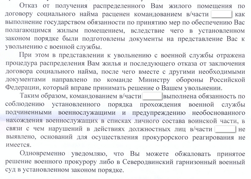 Оказывается, если я, согласно ФЗ, ПП№512, ПМО№1850, выбираю получить жилье в собственность, то моё командование может совершенно спокойно, РАСЦЕНИТЬ что я уже обеспечен жильем и отправить документы на увольнение!!!!! Именно - расценить. Я даже отказа от ДСН никакого не писал, я просто заявил, что желаю получить в собственность! Мало того, как я уже писал, у меня уже есть Решение суда годичной давности, в котором прописано, что КЧ представить меня к увольнению после получения жилья... ЭТО БРЕД! И это пишет ПРОКУРАТУРА! Я на грани срыва