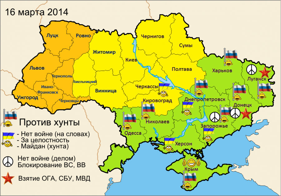 Сначала за единство страны выступала Россия, а Запад стремился отщипнуть большой кусок с Запада. Затем уже Запад, почуяв халяву, захотел всю Украину, только уже себе, а Россия вроде как слабо и неуверенно боролась за влияние в ЮВУ. Теперь опять Россия, забрав себе приз в виду Крыма, заберет себе всю Украину при полном непротивлении Запада, которому останется в лучшем случае долго и упорно отмываться от украинского гуано, в которое он добровольно залез по уши. При этом всячески уговаривая Россию поменьше вспоминать об этом кошмаре в публичной сфере.