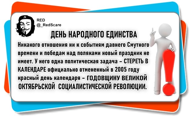 НЕ знаю как уж истории верить, ведь ее в России переписывали неоднократно под каждого управителя. Надо понимать, что в России все делается от противного! Если сделали государственным праздник Народного единства, то ни кто ни чего в этом направлении делать не собирается. Единство этой власти не надо. Народ объединяется вокруг национальной идей и национальных ценностей. Кто за крайние 25 лет пытался воссоздать национальную идею в России! Ответ: никто! Все делается для того, чтобы любым способом удержать власть, т.к. власть приносить доход и благосостояние. Даже военных поделили на юрЫстов и остальных военпенсов! А далее: разделяй и властвуй! :oops: