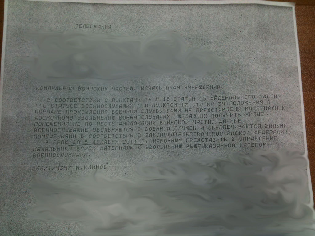#4409Судя по адресации тлг, Климов - шишка небольшая. Если бы такая указивка была сверху, здесь появилась бы копия данного документа. Очередной безбашенный, которого надо ставить на место.Добрый день. Сегодня я как военнослужащий, находящихся в распоряжении, пришел на построение и всех заштатников ожидала неприятная телеграмма пришедшая 30.11.11: