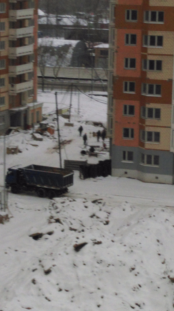 У 3к рано утром бригада отделочников, человек 7, грузили смесь к подъему на верхние этажи.
