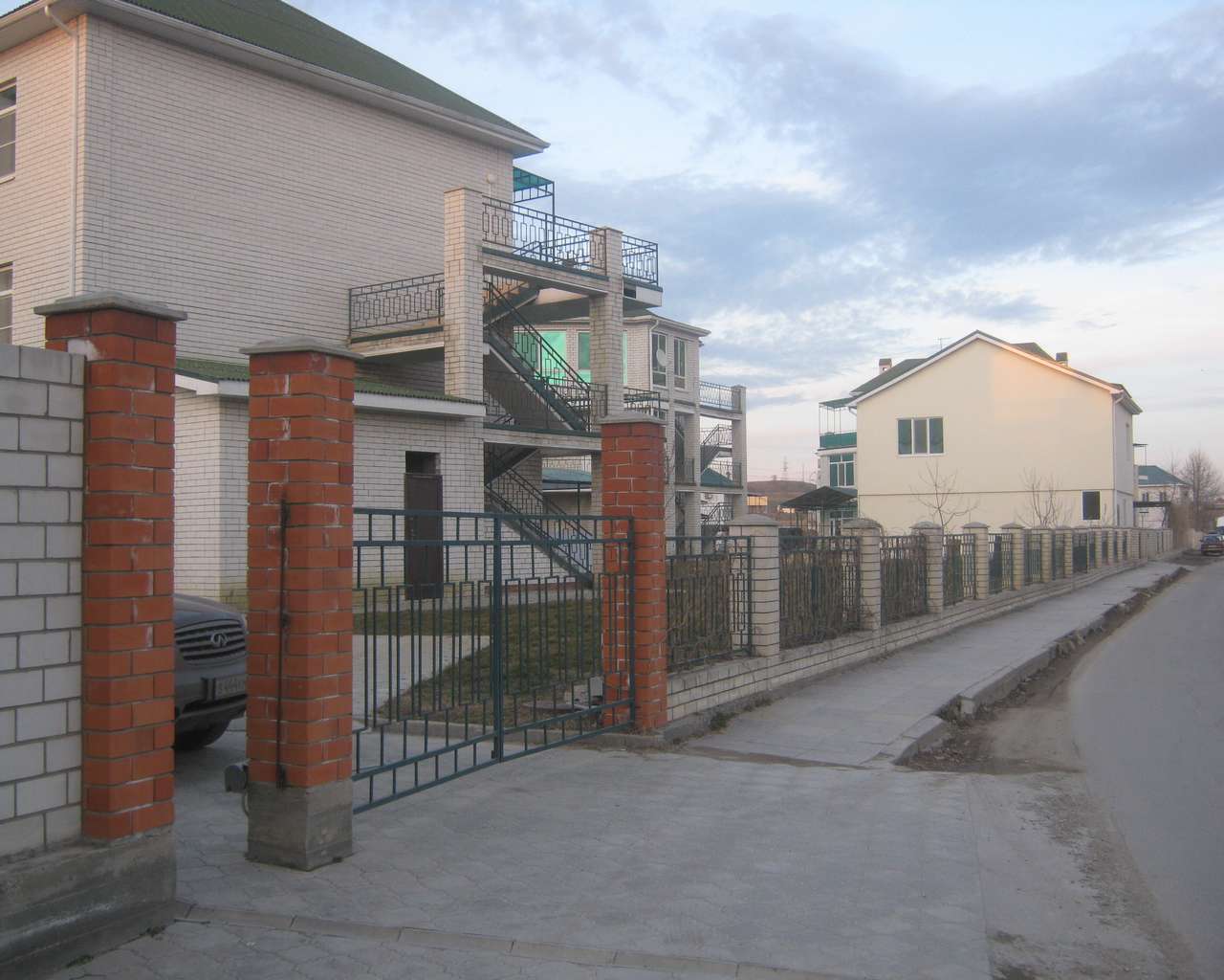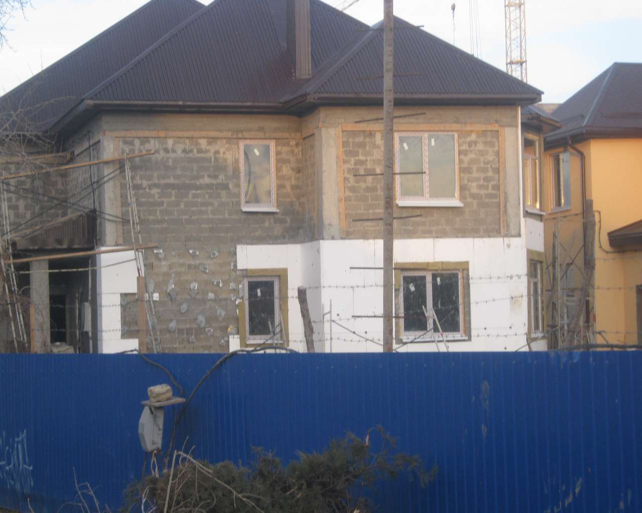Добавлено спустя 2 минуты 53 секунды: Это единственный не отделанный утеплением коттедж, он стоит прямо у тротуара /край ограждения/. Отделка та же, что и на Крылова - пенопласт и сверху короед. Крыши пошикарней - современная еврочерепица