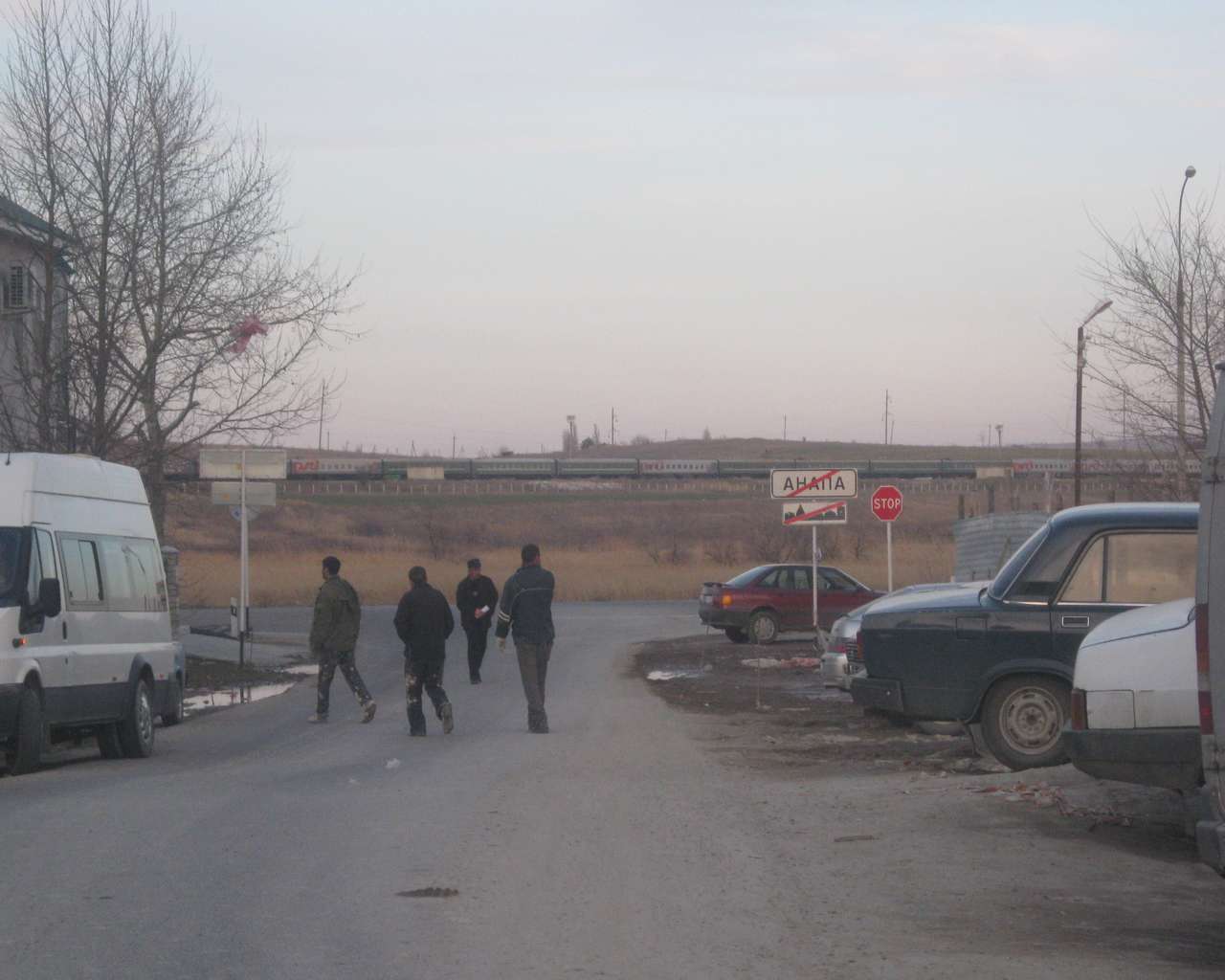Добавлено спустя 4 минуты 53 секунды: Сразу за девятиэтажными зданиями Вы видите: по центру в метрах 500х - железнодорожный узел. Слева угол бензозаправочной станции и знака город Анапа при въезде /слева/ и на выезде /справа/. Строители уходят с объекта после работы. То есть это то место, о котором говорилось выше - первый въезд в Анапу со стороны Воскресенска . Красная машина справа поворачивает как раз на Симферопольское шоссе, параллельно которому и стоят у дороги эти 9-ти-этажки
