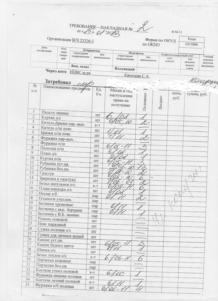 Всем доброго времени суток! Братья по оружию, такая проблема, исключили в мае 2013 без должного обеспечения ДД и вещевым в натуре... ДК за вещевое выплатили. Суд перенёс дату на июнь, а т.к. в училище вещевое выдавали в июне, соответственно наступает право на получение вещевого и соответственно я полагаю необходимо делать новый расчёт на ДК за вещевое. Писал КЧ об этом, в ответ разные отписки, типа приезжайте получайте вещи... На руках имеется исполнительный лист по вещевому, пока не запускал в ход... Вопрос: Кто из нас прав? Должны ли делать новый расчёт? Если ДА, то КАК ДОБИТЬСЯ НОВОЙ СПРАВКИ-РАСЧЁТА ДК? Вот январская накладная, по ней ничего не получал, оригинал в суде в деле. Заранее всем спасибо!