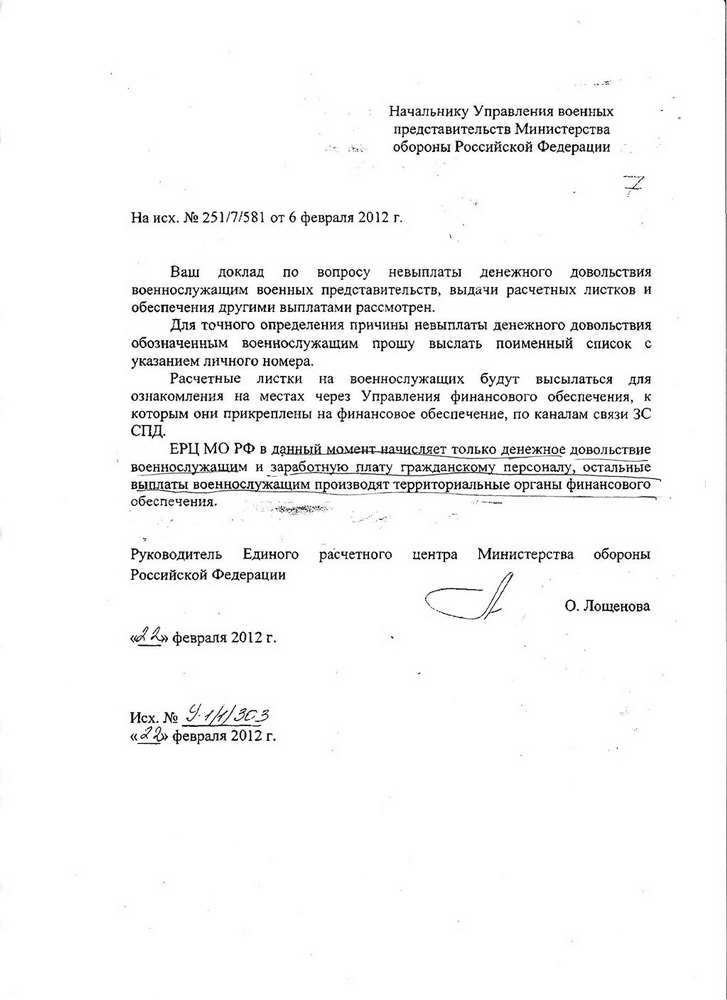 Открою Вам военную тайну - от стараний Вашего бывшего тоже ничего не зависит. Пока листы сверки со всех мест, где проистекает военная служба, не доберутся обратно в Москву. Т.к. спасение утопающих -дело рук самих утопающих, то в тех листах опять будет масса ошибок со всеми вытекающими последствиями и для БМ и для БЖ. Пройдено при передаче баз из УФО в ЕРЦ (декабрь 11- январь 12 года). Подробности здесь:я так мало получила, потому что и БМ получил всего 20 тыс. и что теперь только от его стараний зависит перерасчёт, а я тут ничего поделать и не смогу