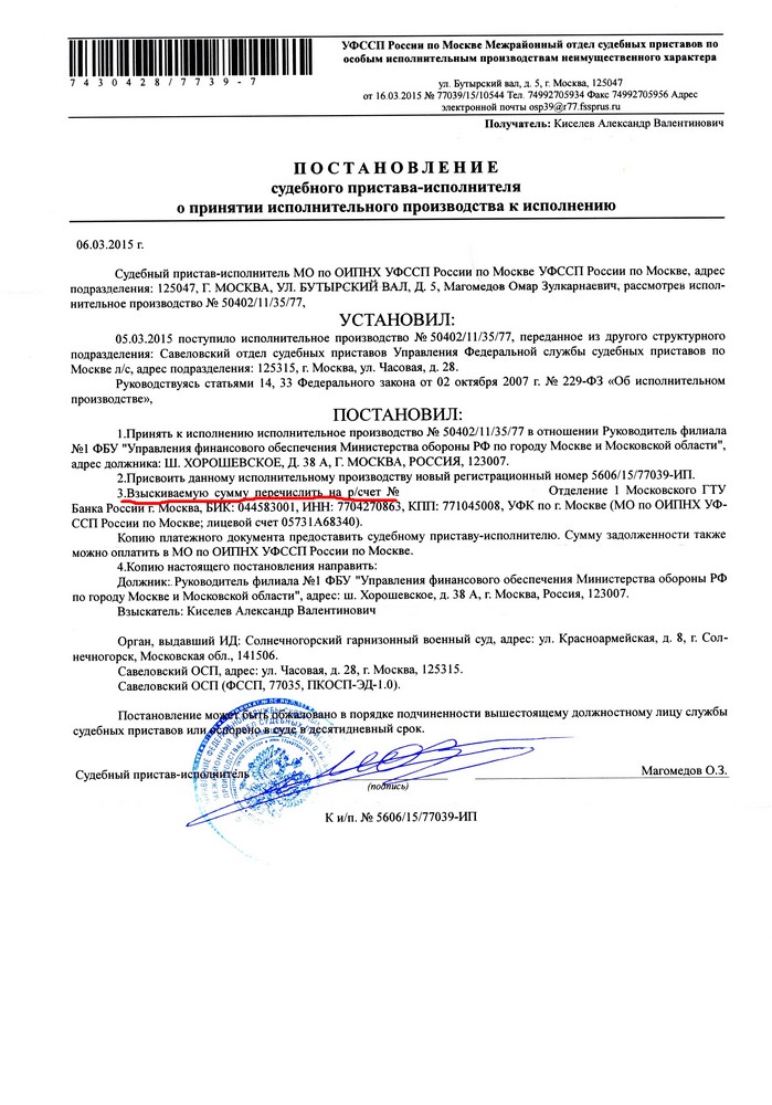 Буквально позавчера получил на рук исполнительный лист. Прошу подсказать куда его надо направлять - в службу судебных приставов, федеральное казначейство или в сам военкомат?
