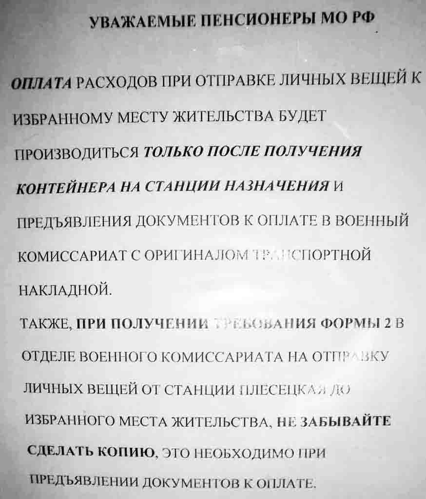 Понимаю, что большинство уже сориентировалось и планирует доставку личных вещей автотранспортом. Но, для расчёта оплаты автоперевозок необходимо подтверждение справкой о стоимости провоза контейнеров ж/д транспортом. Советую в ближайшее время посетить сию товарную контору на ж/д ст.Плесецкая, иначе придётся отправляться в дальний путь на ж/д станцию Обозерская. Аналогичный совет также получил сегодня от работников Плесецкого отдела военкомата. Со стенда информации сфотографировал листы информации по оплате перевозок.