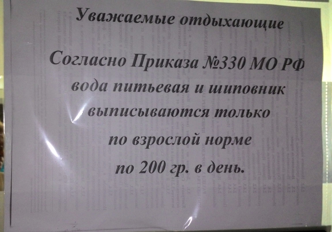 #4848Не знаю, нам разносили всё официантки на стол. А кастрюльки с супом - так он еще и оставался, если за столом выбирали разные супа, то другие разливали прямо стола в тарелку. Отдыхающих в варочный цех за доппорциями никто, естественно не пускал. Да и ВСЁ сожрать было невозможно, и даже так наели по 2-4 кг все отдыхающие.Рыбу как раз солдату дают. Меню почитаешь -нормально вроде бы, а порции маленькие ,кроме супа без мяса и каш, Мужчины возмущались, а один просто подходил и брал вторую порцию второго со словами я не наелся Никто ему даже не пытался возразить Это на б/о СевастопольQR_BBPOST Хм...Не знал, что в солдатский паек входят красная икра и рыба))