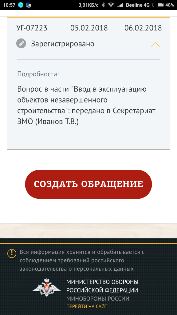 #48481Здравствуйте,обращался через сайт министерства обороны по срокам сдачи 16 корпуса ,до сих пор в личном кабинете висит информация,что обращение зарегистрировано и передано в секретариат ЗМО Иванова . Кто может подсказать примерные сроки ответа ,из тех кто обращался,меняется ли статус обращения , например из" зарегистрировано" в "отправлен ответ" и т.п.?Прошло почти 2 месяца.