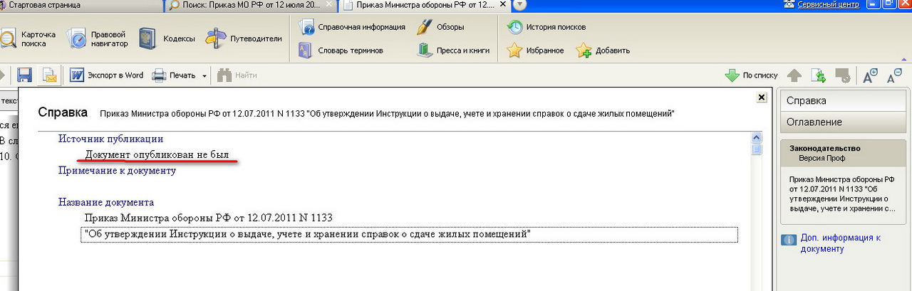 Первый на форуме "Приказ 1133" выложил "Наивный" со ссылкой помоему в "Гарант".Но на сайте МО ни самого Пр. ни его проекта не нашел,в часть Пр. не поступал.Самое интригующее то,что нет № регистрации в Минюсте.Инструкция,утв. Пр. подписана Колычевым.Может это его "хотелки" и после его убытия обратно в ЮРУЖО "проект" остался не реализованным? Тогда почему Пр. есть в "Гаранте"? Одни непонятки.