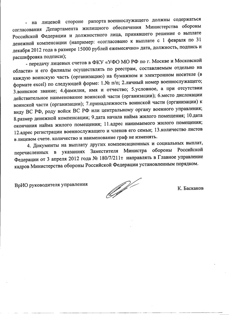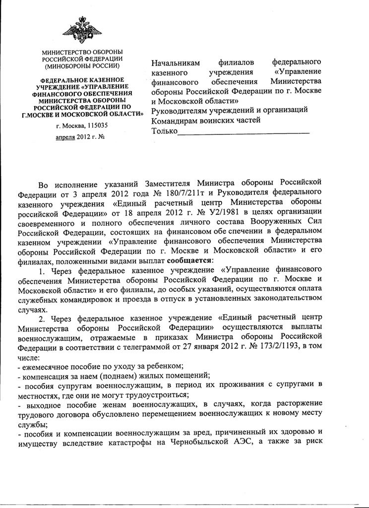 #515Этот документ какая-то филькина грамота. Нам в часть тоже прислали. Бред этой писульки в том, что указание от 3 апреля за подписью ЗМО по ФЭР Швецовой совершенно внятно и чётко определяет полномочия финансовых органов: ДД выплачивает ЕРЦ, компенсации, в т.ч. за наём жилья - УФО. Собственно говоря, посты frederic13 со ссылкой на решение суда это подтверждают. Уфологи же, как видим, "исполняя" указание начальника, занялись самодеятельностью и переводят стрелки по выплате компенсации за наём на ЕРЦ. Типа, "мопед не мой, я только объяву разместил".Поступил вот такой документ