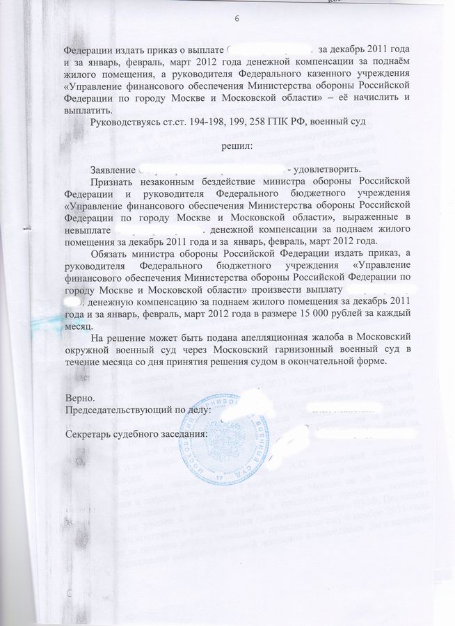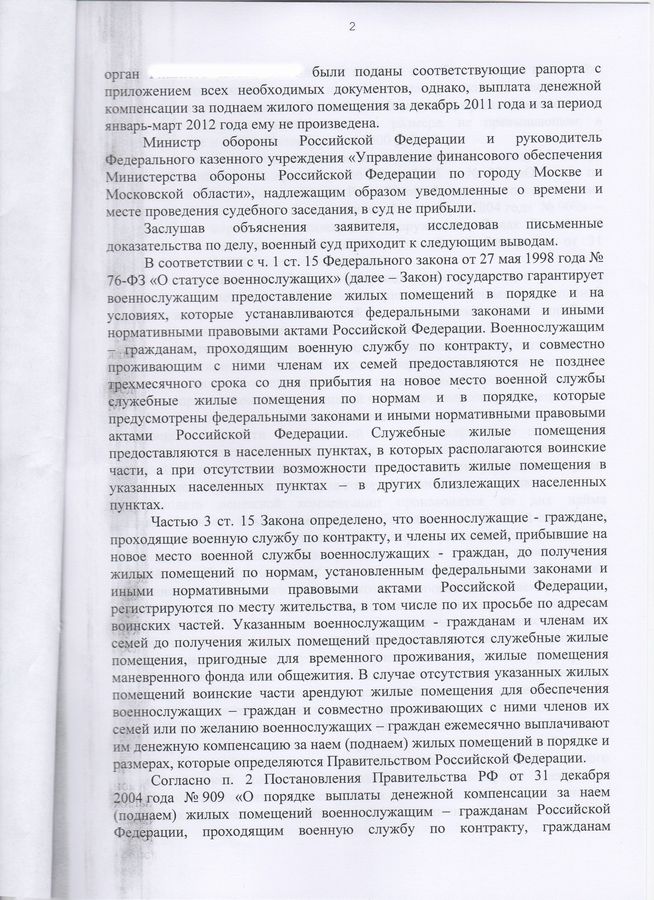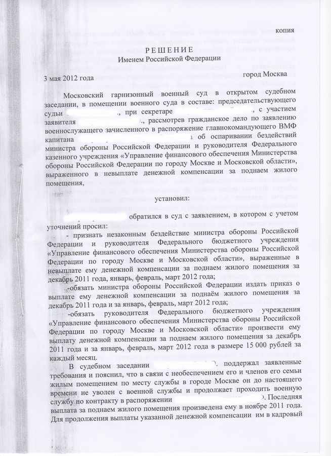Мне судья сегодня сказал, что ЕРЦ просто захлебнулся только с выплатой ДД. Поэтому выплаты за наем и т.д. возложили на УФО. Хотя, говорит, с 1 апреля должны были УФО ликвидировать, но поняли что в полной ж.... и пока оставили их. Сегодня в ГШ ВМФ собирали доки на поднаем для УФО.Этот документ какая-то филькина грамота. Нам в часть тоже прислали. Бред этой писульки в том, что указание от 3 апреля за подписью ЗМО по ФЭР Швецовой совершенно внятно и чётко определяет полномочия финансовых органов: ДД выплачивает ЕРЦ, компенсации, в т.ч. за наём жилья - УФО. Собственно говоря, посты frederic13 со ссылкой на решение суда это подтверждают. Уфологи же, как видим, "исполняя" указание начальника, занялись самодеятельностью и переводят стрелки по выплате компенсации за наём на ЕРЦ. Типа, "мопед не мой, я только объяву разместил".