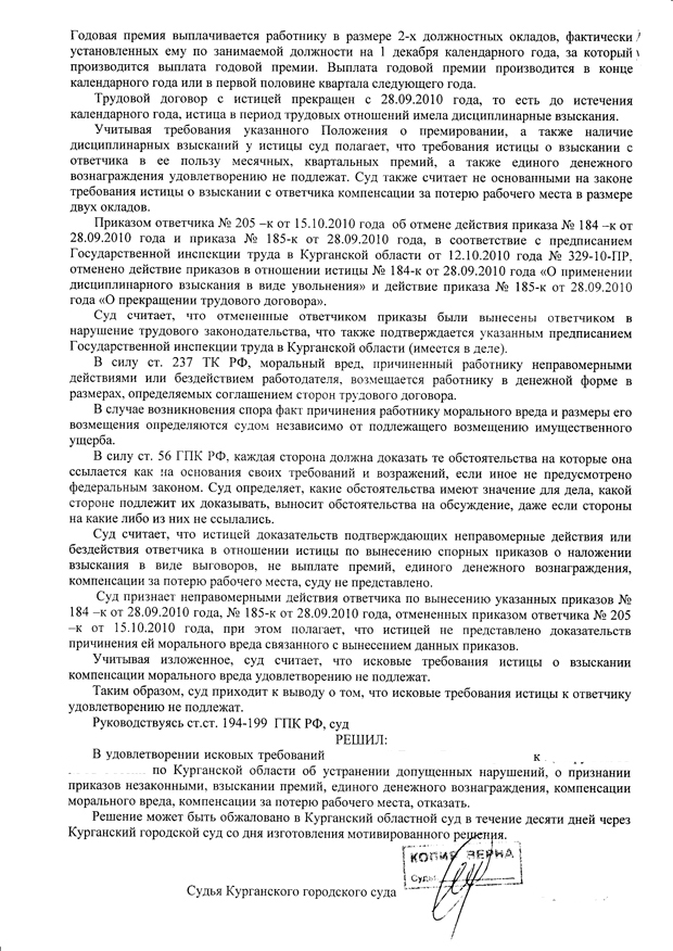 был суд 30.11.2010г. отказал истцу т.е. мне во всех требованиях, потом 16.12.2010г. было дополнение к решению - выплатить 10 тыс. морального вреда за незаконное увольнение, в остальных требованиях по прежнему отказано, это уже после подачи мною кассачки