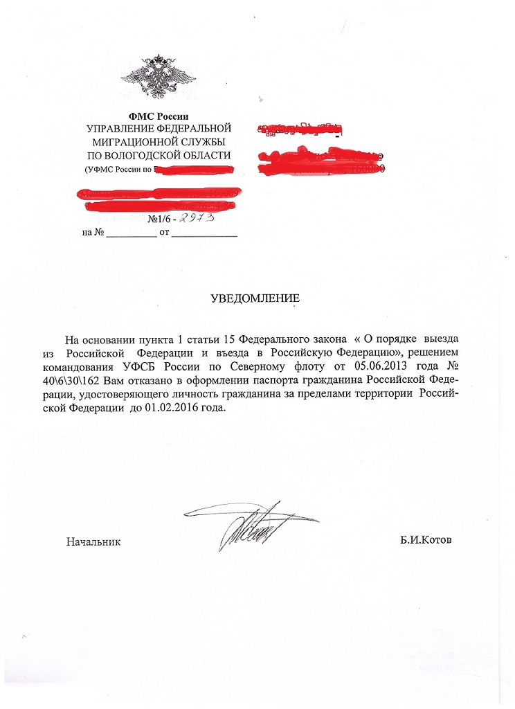 отказ уменя от УФСБ России по Северному флоту. Тут командование моей вч и ФМС получается ни причем... Странно как то .