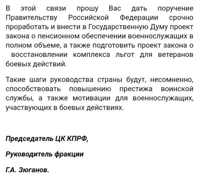 Росстат давал официальную инфляцию в размере 4,91%,а Мишуткин все равно подписал Постановление об индексации ОДС на прогнозируемую ранее инфляцию в 3,7%,наперсточники одним словом.Зюганов уже более 30 лет в ГД и толку как от козла молока,спойлеры правящей партии как и СР,ЛДПР во главе с сыном юриста и русской матерью.Да и в письме дедушки Зю содержится просьба отменить понижающий коэффициент для ветеранов БД,а остальным оставить в прежнем объеме.