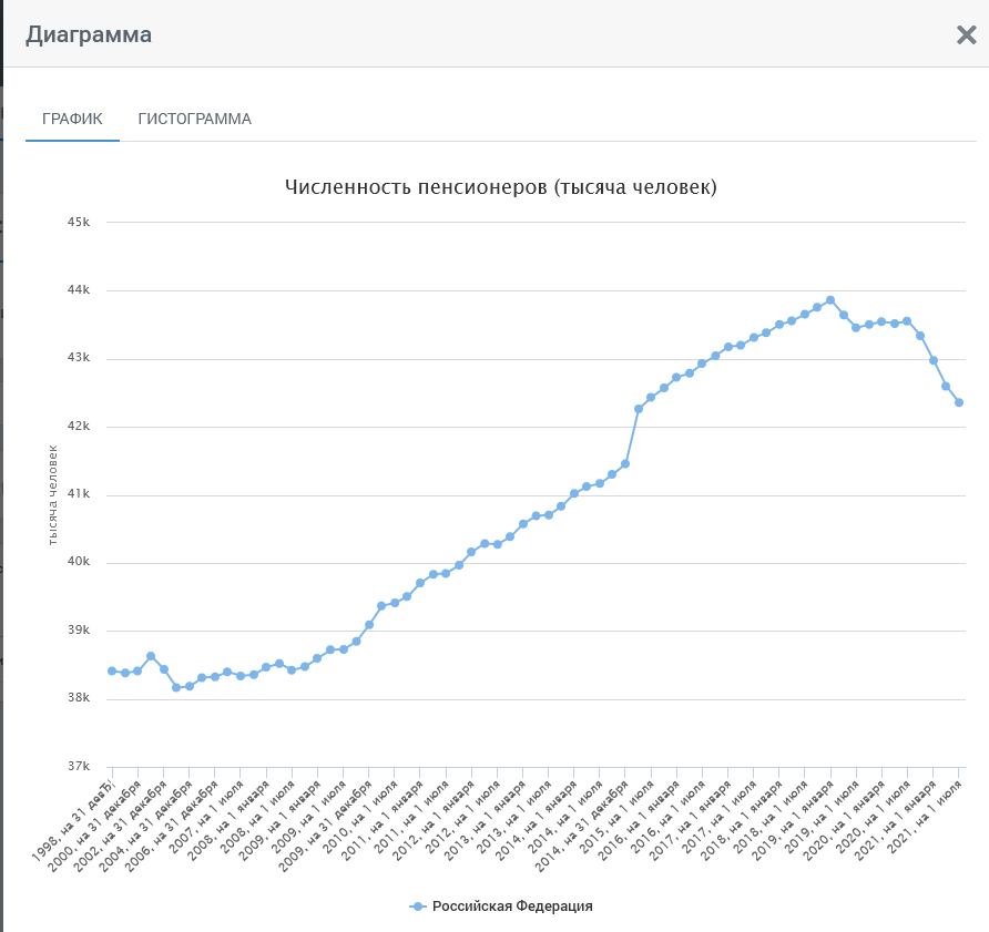 С пиковых значений — 43,865 млн человек на 1 января 2019 года — численность пенсионеров за 10 кварталов уменьшилась на 1,51 миллиона человек.