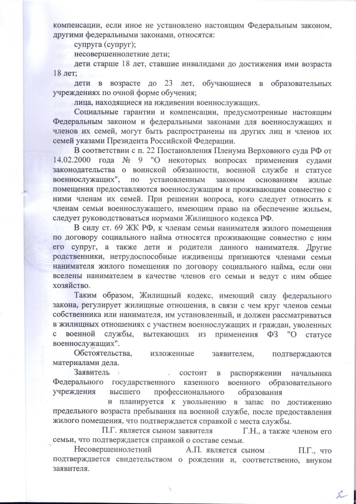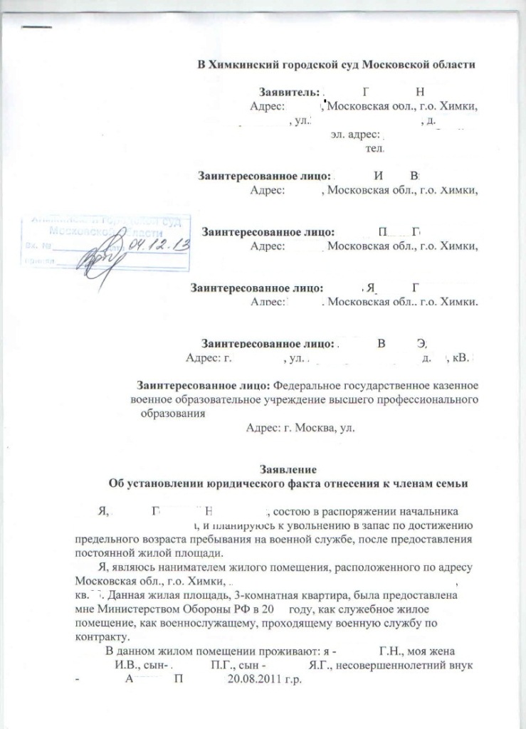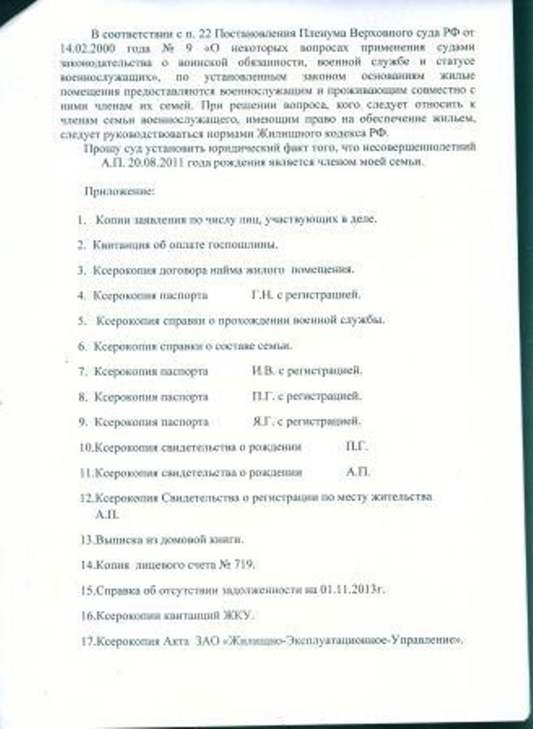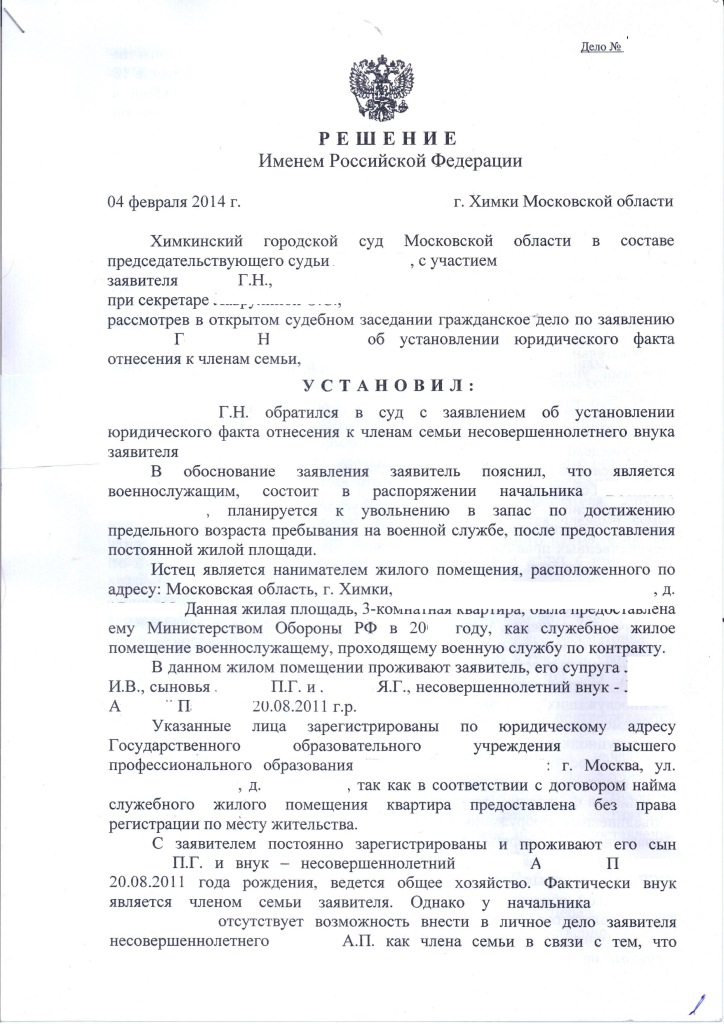 выкладываю заявление и решение суда об установлении юридического факта отнесения несовершеннолетнего внука к членам семьи.http://voensud.ru/resources/image/46659