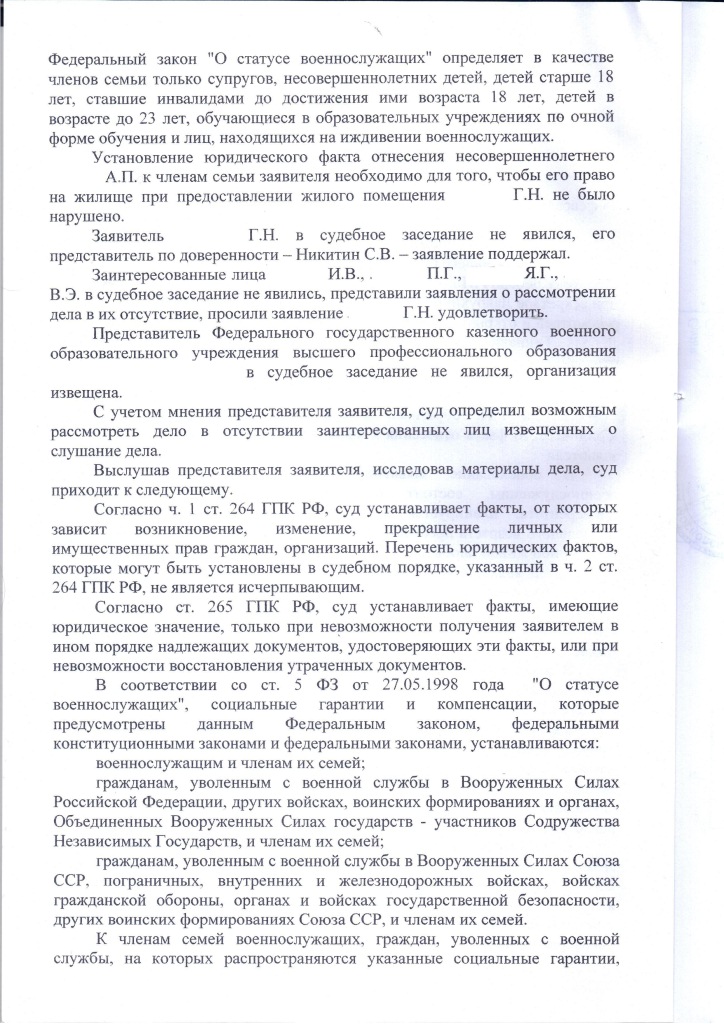 #5210А как такой вариант: в личном деле есть ребенок жены от первого брака, совместно проживает, на втором курсе института, стоим на учете тоже все, НО!СВЕРШИЛОСЬ!!! После двухлетней борьбы с ДЖО за признание внука членом моей семьи, позавчера получил Решение Химкинского городского суда, вступившее в законную силу, а вчера уже и справку из части(после подачи рапорта о внесении внука в л/д) о составе семьи - с внуком в том числе.