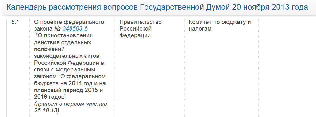 Ну не знаю, куда Вы смотрите. Кроме самого бюджета, рассматривается этот закон. Откройте и прочитайте.20 ноября 2013 года ничего подобного к рассмотрению не запланировано