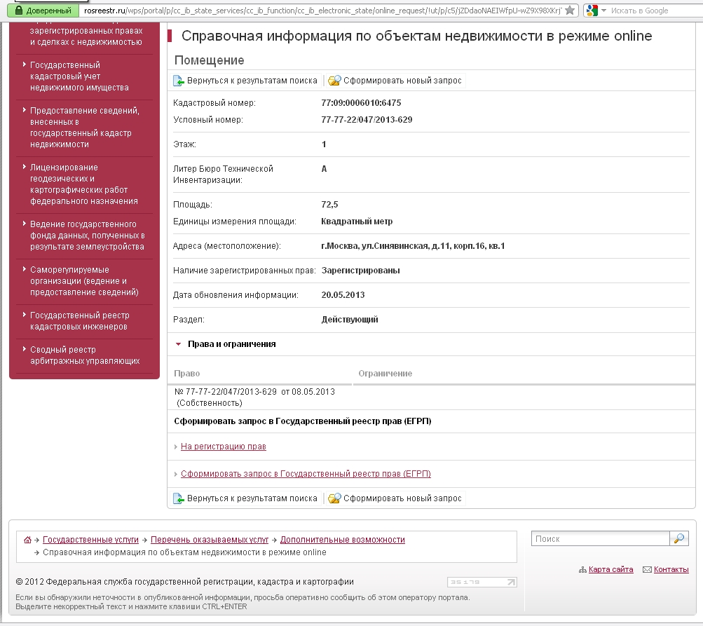 На сайте Росреестра появилась информация о регистрации прав собственности РФ на квартиру 1 в 16 корпусе от 08.05.2013 г.: