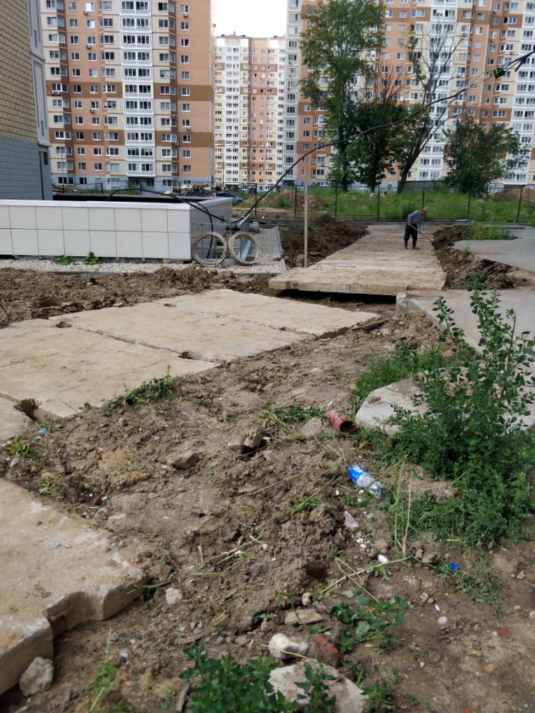 #53723Предчувствия меня не обманули! Проезд выложенный из плит, это и есть «дорога» к к.12( попробуй развернись). Забор перенесли на поляну где должно быть ДДУ. Там появились подвижки. Вырыт котлован и видны трубы ввода. Асфальт как был, так и остался весь у к.24/1, а чтобы по нему не ездили ( вещь дорогая),положили блоки, счастливые новоселы паркуются на бетоне принятого в эксплуатацию корпуса! В отличие от нашего «объекта застройки» вокруг кипит работа: меняют бордюрный камень на гранитный, делают дорожки к метро возле гаражей, готовятся к заселению в соседний комплекс зданий...Наверное, обнесут нас забором, чтобы не лазили к ним в сад.Завтра еду в МФЦ забирать паспорт с пропиской, заеду- посмотрю! Думаю, асфальт сам не появится!А что там с асфальтированием территории возле вашего корпуса?.