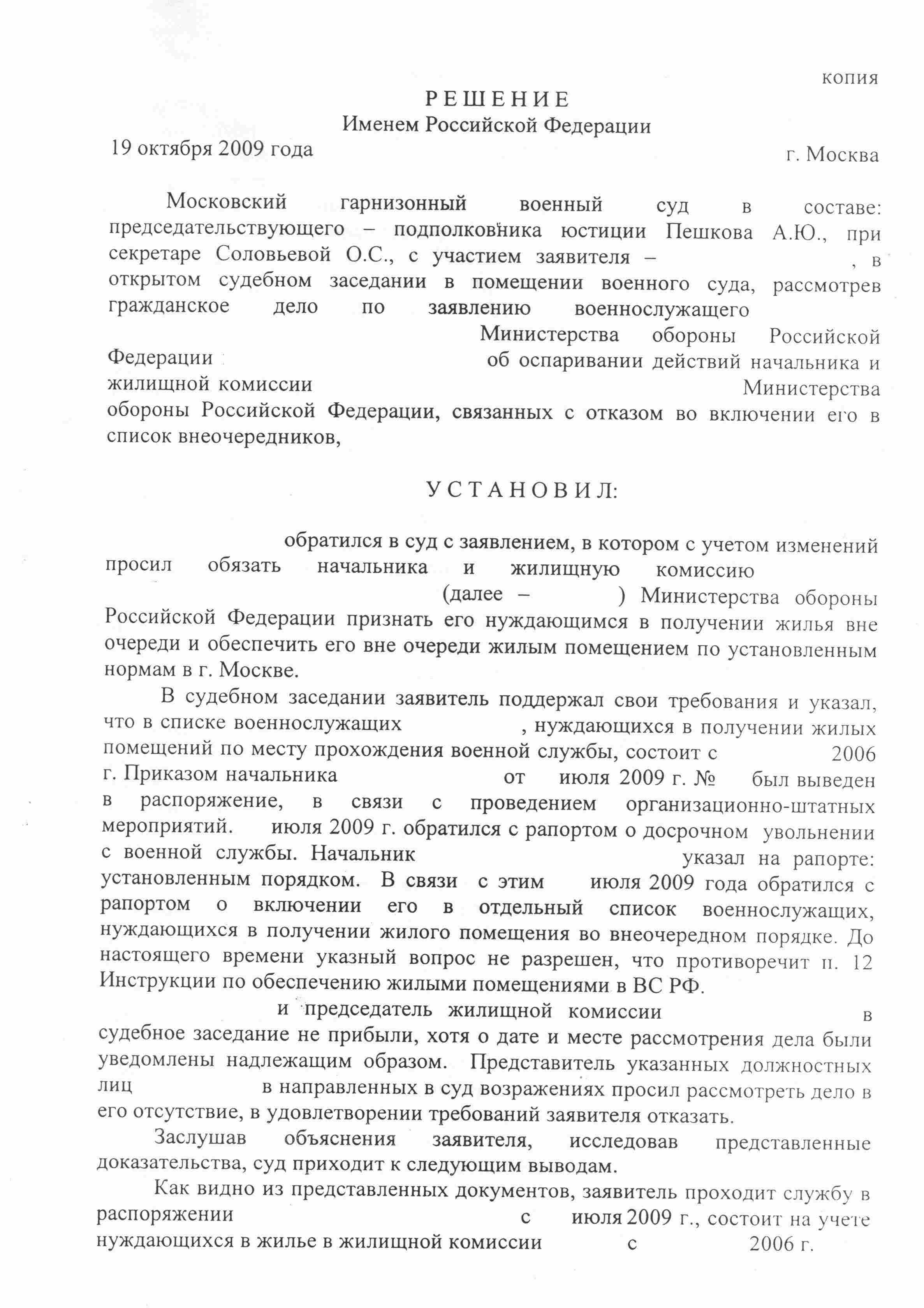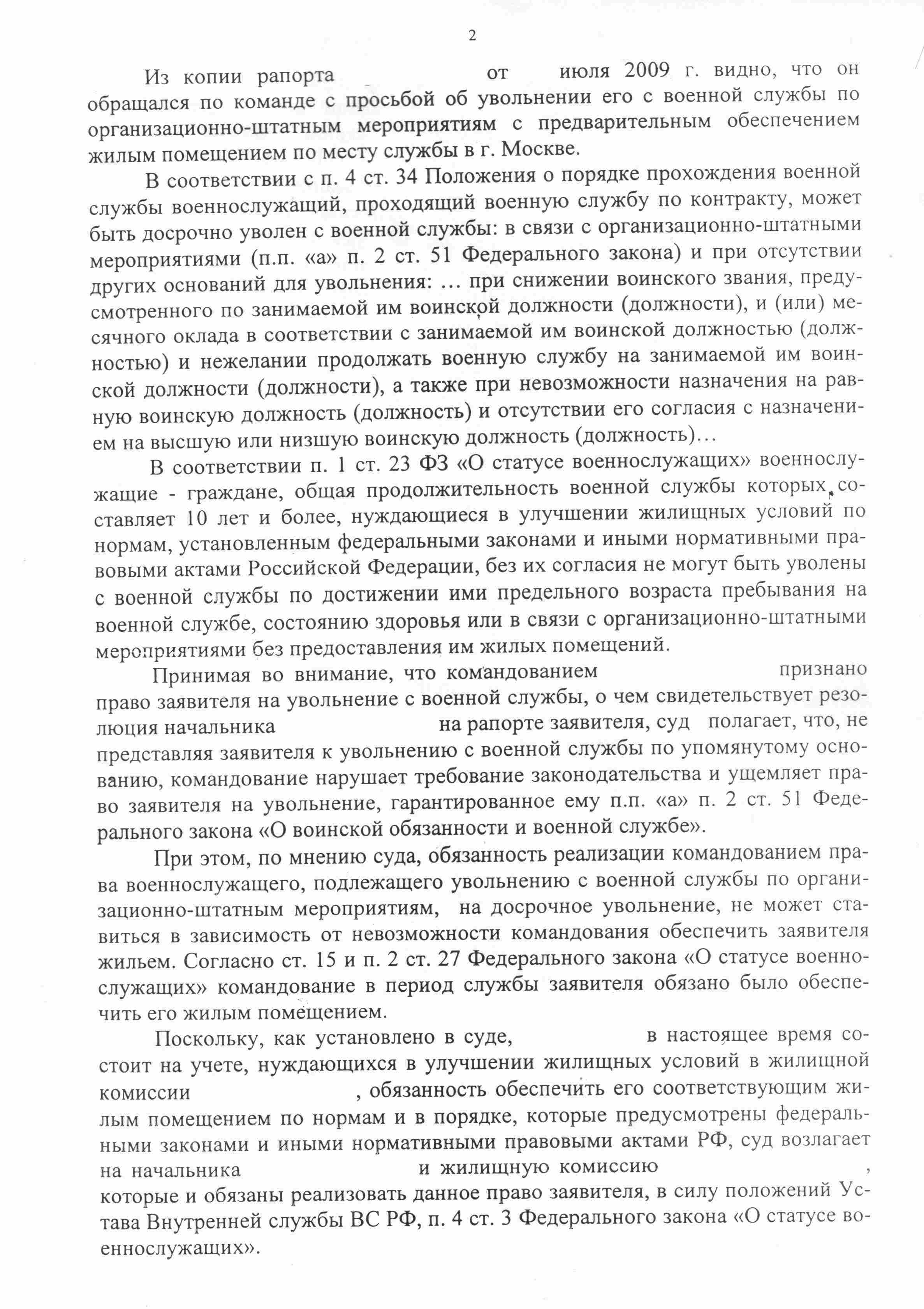 М-м-да, воспринимать решение "установленным порядком", как решение об увольнении(представлении к увольнению), при обстоятельствах необеспеченности заявителя жильём и представленных в суд возражениях командира…Реально, запас "спайса" в чудо-судах ещё некоторое время будет расходоваться…решение МГВС о признании права на внеочередное обеспечение жильем офицера подлежащего увольнению по ОШМ, не имеющему на момент рассмотрения дела 6-ти месячного "стажа пребывания в распоряжении".