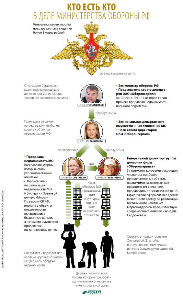 Министр обороны Сергей Шойгу провел масштабные чистки в своем министерстве. Анатолий Сердюков вместе со всем своим ближайшим окружением изгнаны из министерства и находятся кто где, но большинство — либо уже получили реальные сроки заключения, либо находятся под следствием и домашним арестом.