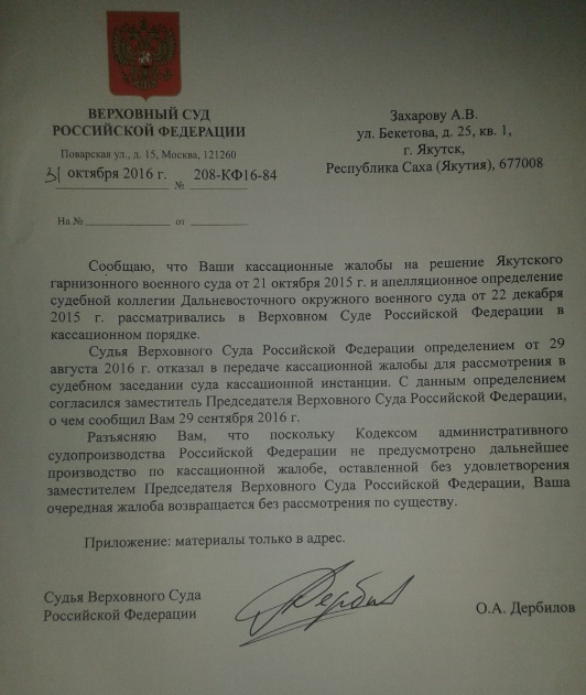 Также не забудьте указать в жалобе, что определением судьи окружного военного суда от хххх в передаче Вашей кассационной жалобы для рассмотрения в судебном заседании кассационной инстанции отказано, а также приложить данное определение и состоявшиеся по делу судебные акты к жалобе (сделайте ссылку на указанные обстоятельства после абзаца, где Вы пишите о том, что суд апелляционный инстанции оставил в силе решение гарнизонного военного суда.