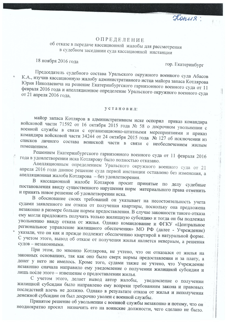 20.10.2016 г. я подал кассационную жалобу в Президиум Уральского окружного военного суда. 18.11.2016 г. вынесено определение об отказе в передаче кассационной жалобы для рассмотрения в судебном заседании суда кассационной инстанции (далее - Определение, приложение №5).