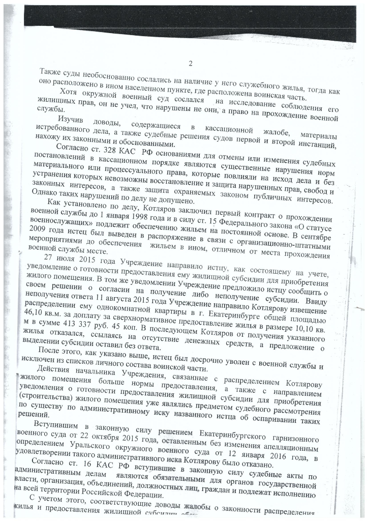 Так же в апелляционном определении Окружной суд ссылается на то, что я имею служебное жилье по месту службы (абзац 1, стр.5), но это не соответствует истине, так как служебное жилье у меня в другом населенном пункте, т.е. в городе Екатеринбург, село Горный Щит, в/ч 51130, а часть дислоцируется в городе Березовский. Судебная коллегия по делам военнослужащих в «Обзоре судебной практики Верховного суда Российской Федерации», утвержденном Президиумом Верховного Суда Российской Федерации от 13 апреля 2016 года № 1, прямо указывает на недопустимость увольнения военнослужащих, не обеспеченных служебным жилым помещением по месту прохождения военной службы. Своим Определением от 26 мая 2016 г. № 1046-О Конституционный Суд Российской Федерации устанавливает, что пункт 17 статьи 34 Положения о порядке прохождения военной службы «предусматривает для определенной категории граждан право приобрести жилье за счет средств федерального бюджета по избранному в связи с увольнением с военной службы постоянному месту жительства и содержит запрет на увольнение военнослужащего, который не обеспечен жильем. Аналогичное по сути положение установлено в абзаце втором пункта 1 статьи 23 Федерального закона от 27 мая 1998 года № 76-ФЗ «О статусе военнослужащих».