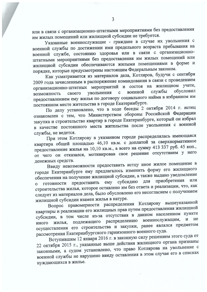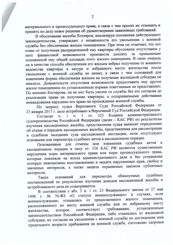 Судьи у меня наличие жилья сильно не рассматривали. Как и ответчики на это не опирались. Основное- это отказ от жилья из-за отсутствия доплаты, поэтому предложена ЖС, документы на ЖС не предоставлены, поэтому уволен, то что сначала Уведомление, а потом ордер - это не существенно. Нарушений материального права нет, можно стоять на очереди и при желании получить ЖС. То что заявлялось, что отказ от квартиры с доплатой обоснован Пленумом судьи нигде не упоминали, сослались только на то, что согласно ст.15, могут распределить квартиру большей площади.