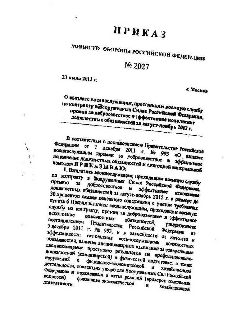 #61Приказ министра обороны № 2027 от 23.07.2012 премия август-ноябрь 2012 (до 30 % каждый месяц)