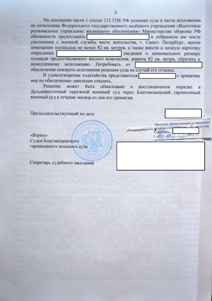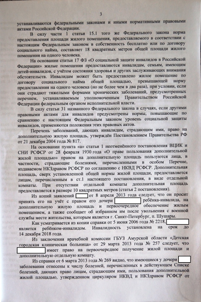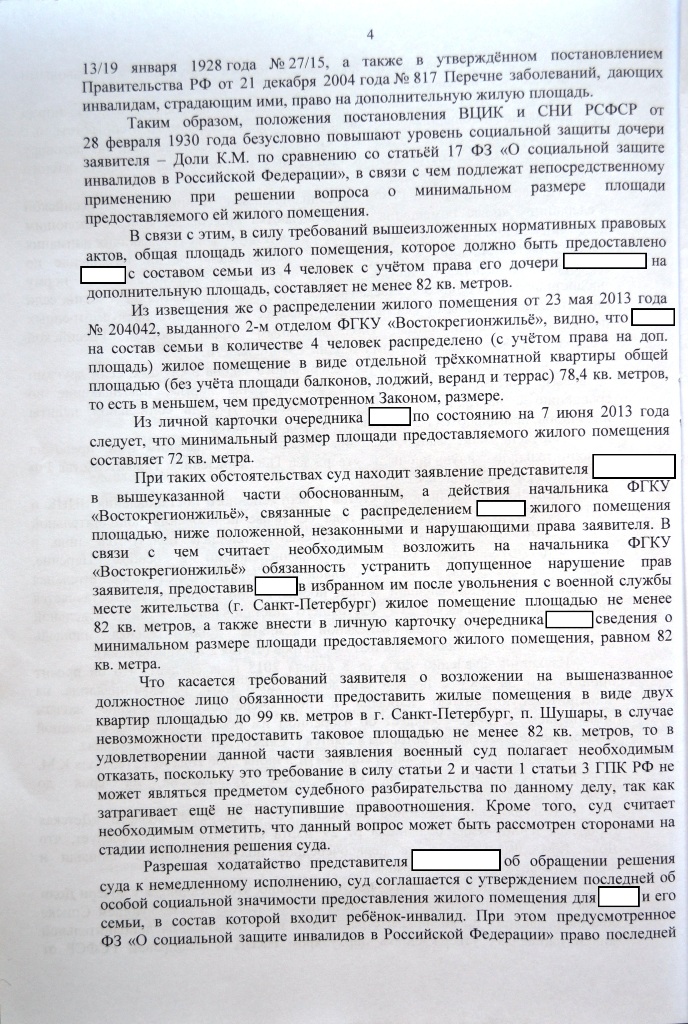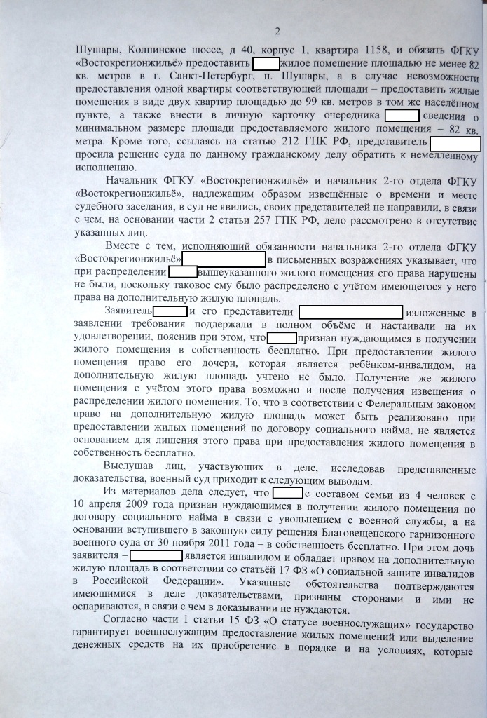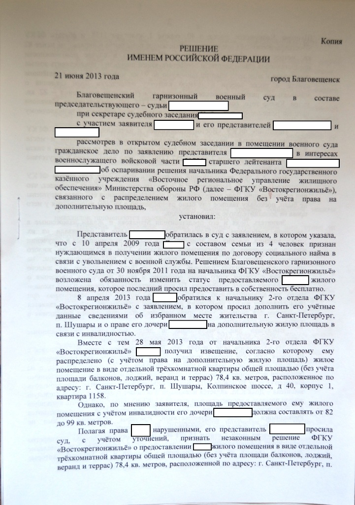 Ёще бы один пунктик не помешал бы в решении: Внести изменение в Единый реестр в Право на Доп. площадь - Да. А у Вас - Нет, и у меня тоже убрали, состав семьи изменили с 3 чел. на 4 чел. А в Праве взяли и убрали. Ответ с Гл: сайт находится в тестовом режиме, не обращайте на это внимание. Мы знаем, что Вам положено до 99 кв.м. Но вот, от скольки-то, не сказали. Так, что буду выяснять данный вопрос. Вам отдельный респект и ждём от Вас выкладки с решением.Ну вот и прошёл суд. Чего хотели то и получили. Спасибо форумчанам за предоставленные сканы. Большую роль сыграли как и решения судов, так и постановление от 1930 года. В понедельник должно быть готово решение в окончательном виде (сразу они не сделали).Если по пунктам:1. признать незаконным распределение жилого помещения.......2. обязать предоставить там же (Шушары(Славянка)) жилое помещение в пределах 82-993. обязать внести изменения в карточку очередника 82-994. немедленное исполнение. 5. распределение 2-х квартир суммарной площадью до 99 квадратов - отказать, так как это не подсудное дело и решается на стадии распределения-обеспечения.Заберу готовое решение, выложу на форуме. Так что пока первый шаг сделан и маленькая победа одержана. Но 1 месяц всё равно на нервах, вдруг апелляция? Хотя вряд ли они (ВРУЖО) будут заморачиваться с очередным головняком для себя.Ex-военный, адвокаты пока не прислали на электронку заявление, в понедельник буду у них, если не пришлют - заберу так и выложу. Все оригиналы документов у них.
