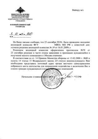 Командование отказало, мотивируя отсутствием полномочий по признанию нуждающейся не по месту службы ( по месту службы нуждающейся признана).Подала заявление в суд- суд отменил решение ЖК об отказе в признании нуждающейся в ИПМЖ в г. Москве и обязал начальника и жилищную комиссию повторно рассмотреть рапорт о признании нуждющейся в г. Москве.Пошел 2 год как решение не исполнено.Исп производство возбуждено( командование пишет приставам , что не понимают как исполнить решение суда ,т.к не наделены такими полномочиями).Я каждый месяц пишу командованию с требованием исполнить решение суда.В ответ -либо тишина,либо стандартная отписка об отсутствии таких полнлмочий.На мое последнее обращение получила шедевр по трактованию закона.